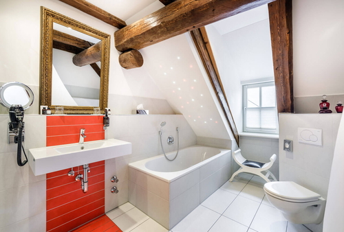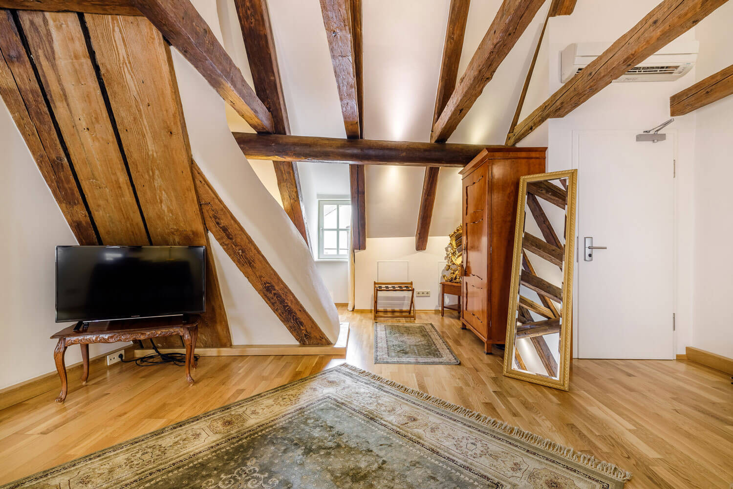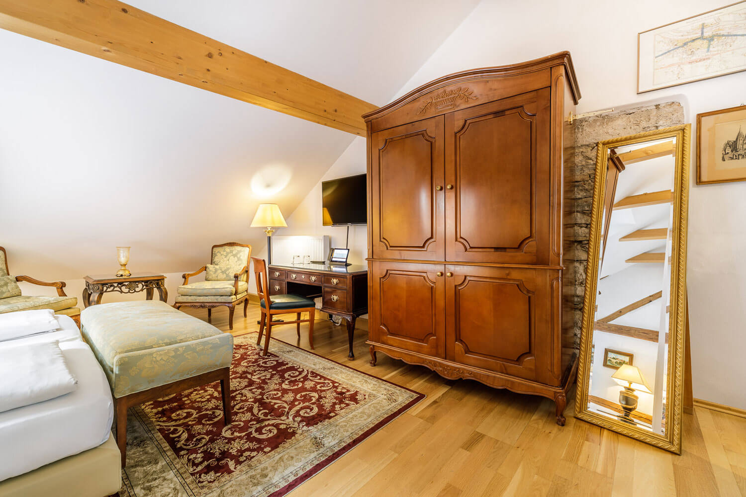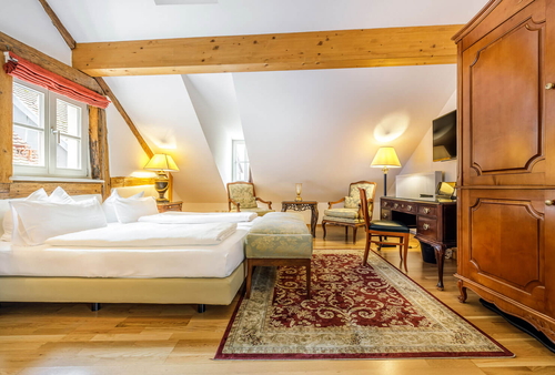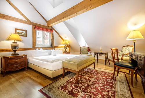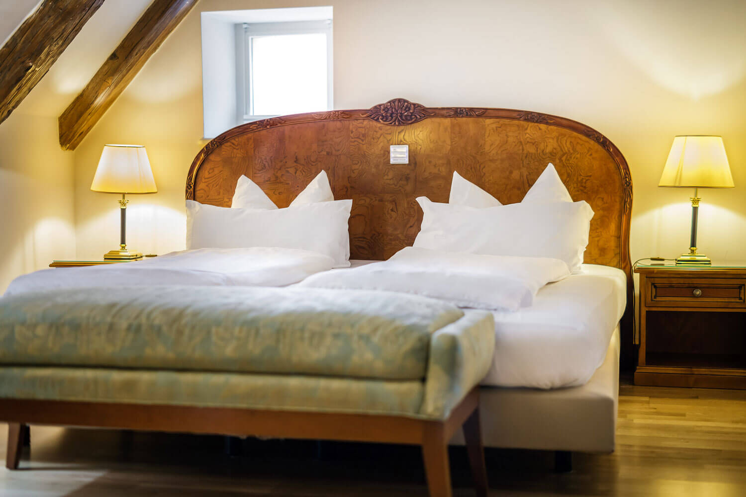 Unsere Superior Zimmer bieten reichlich Raum, um sich zu entfalten. Die beiden stilvoll eingerichteten Zimmer befinden sich in luftiger Höhe im Dachgeschoss des Hauses. Sie verfügen über ein Kingsize Bett, eine Sitzecke sowie ein eigenes Badezimmer mit Dusche und Badewanne. Historische Dachbalken verleihen den Superior Zimmern Gemütlichkeit.
